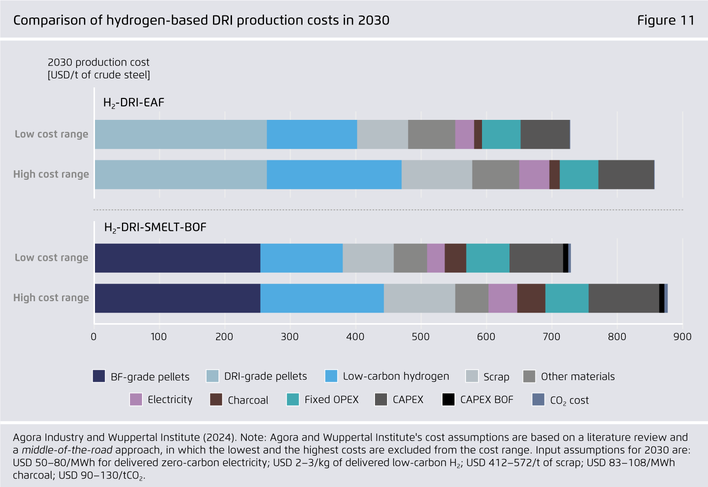 DRI technology can be deployed today and operate with a gradually increasing share of hydrogen; furthermore, it allows the iron and steelmaking stages to be decoupled. Pairing the DRI process with existing basic oxygen furnace (BOF) steelmaking will unlock the use of lower-quality iron ores, as may future iron ore electrolysis technologies.
