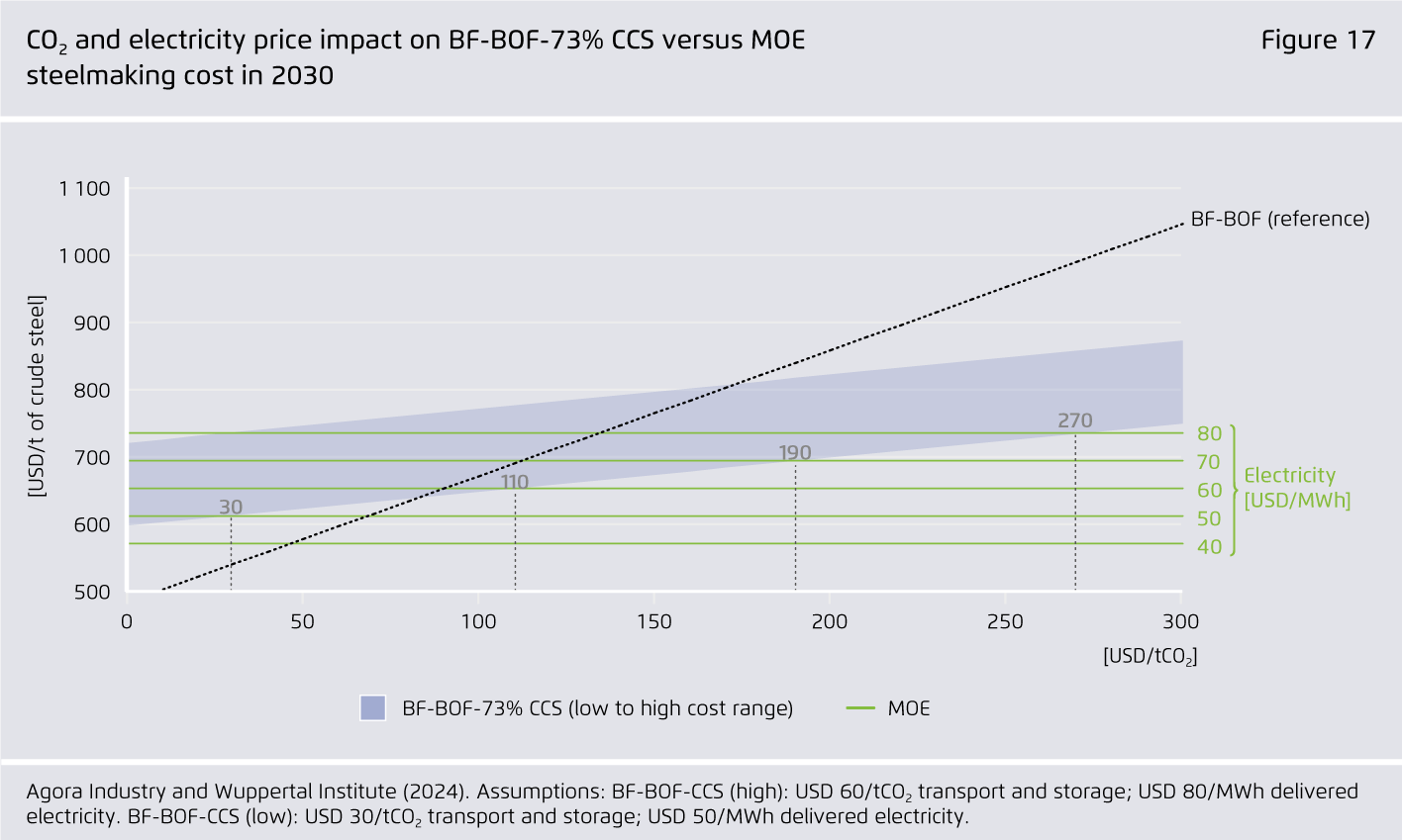 Retrofitting BF-BOF plants with CCS is a risky strategy: it leaves high residual emissions, requires significant CO2 transport and storage infrastructure, needs to take high upstream methane emissions from coal mines into account and will become less and less commercially attractive as hydrogen costs decline and CO2 prices rise.